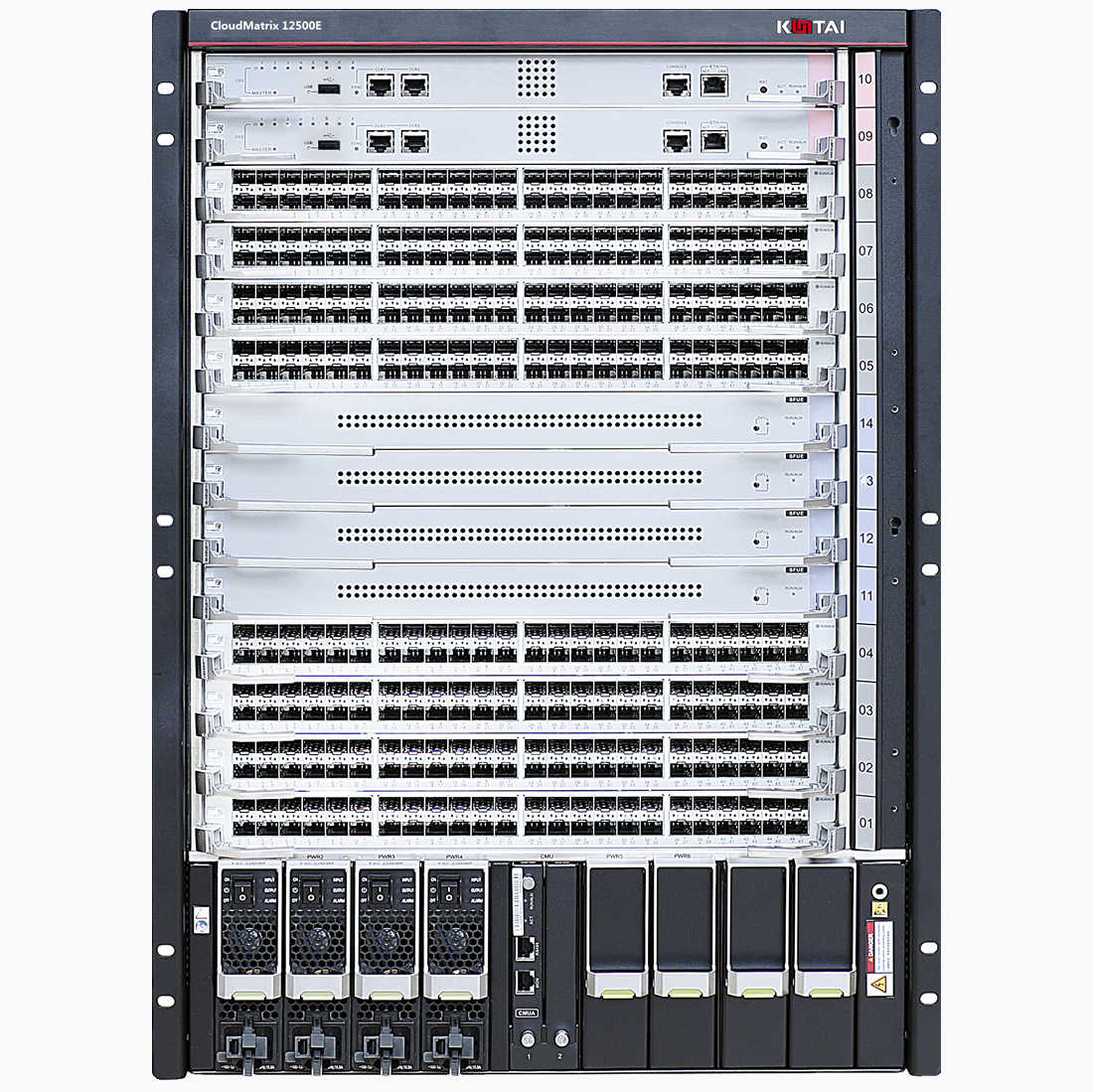 CloudMatrix12500E现给予CM12500E-4和CM12500E-8两种机型,分别支持4/8个业务板插槽。
